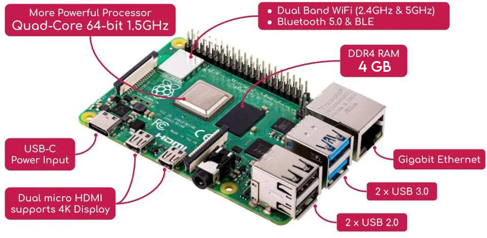 - ใช้ชิพ Broadcom BCM2711, 64-bit ARM Cortex-A72 (ARMv8), Quad-core, 28nm Processor SoC ที่ทำงานที่ความเร็ว @ 1.5GHz ซึ่งใช้ตัวกระดองที่ทำจากโลหะ ซึ่งช่วยเพิ่มประสิทธิภาพในการระบายความร้อน